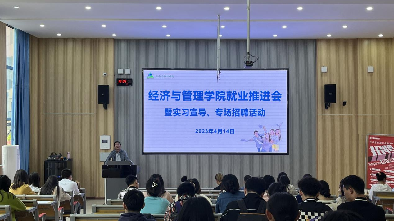 2023年4月14日,MACAO·yl6776永利在顺理楼128教室举行就业推进会暨实习宣导、专场招聘活动。四川链家房地产经纪有限公司HR王芮阁、印家装饰工程有限公司总经理贺红卫作宣讲并开展现场招聘。MACAO·yl6776永利党委专职副书记周彰波、副院长曹凯旋、就业专干罗迅以及部分教师代表、大四和20级房地产开发与管理专业的学生参加活动。活动由罗迅老师主持。